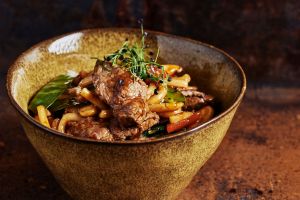 - – legume: broccoli, fasole verde, ciuperci, ardei roșu proaspăt, boia, ceapă verde, noodles sau orez fiert, verdețuri pentru decor.