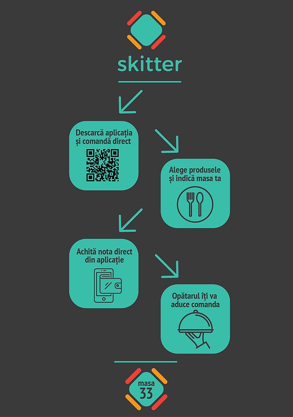 Produsul se cheamă Skitter (https://www.skitter-app.com) și aduce controlul comenzilor direct la clienți, comanda făcându-se direct din aplicație, fiind înregistrată doar după plătirea sa. Procesul este asemănător cu cel al serviciilor de livrare la domiciliu, dar țintește doar clienții ce sunt așezați la masă, utilizatorul trebuind să introducă și numărul mesei la care se află.
