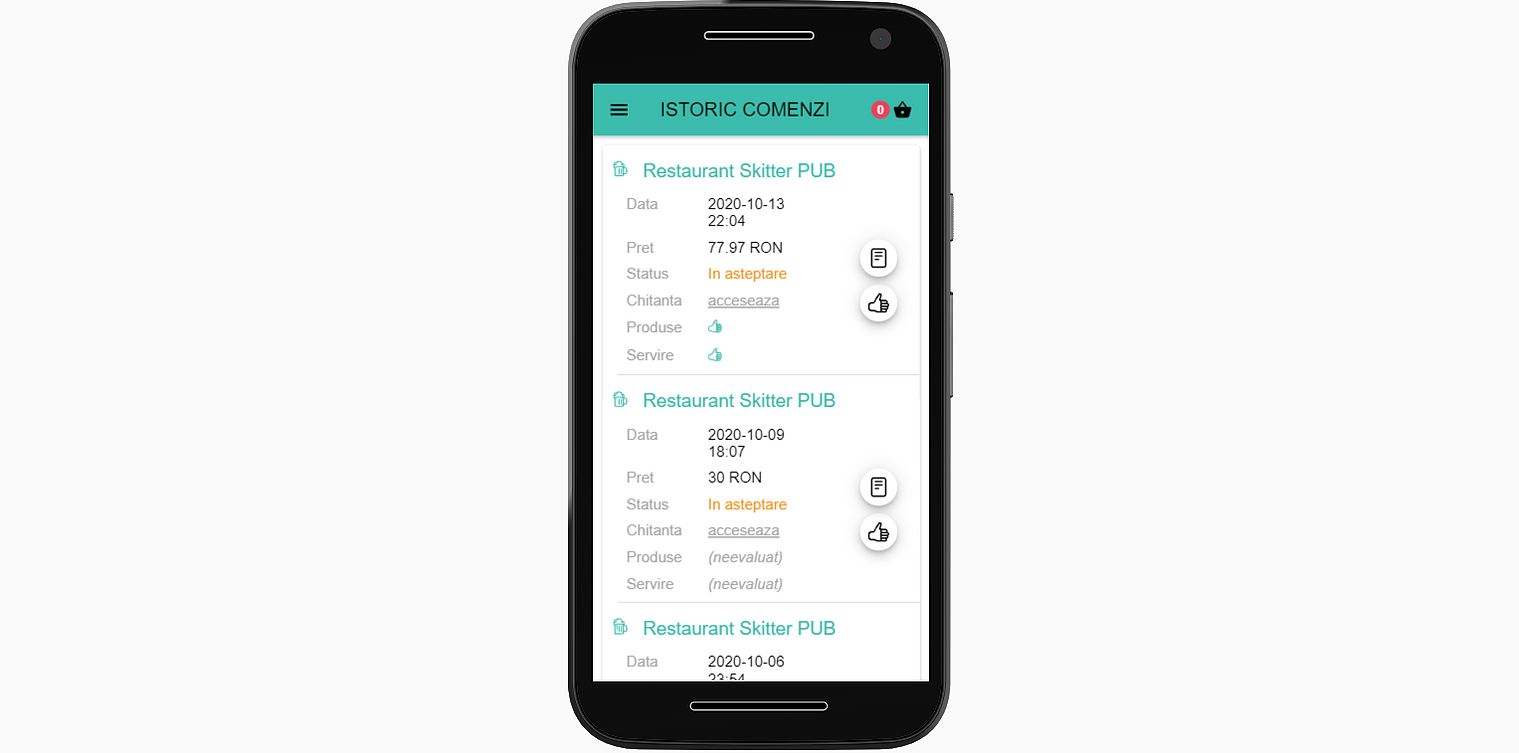 Aplicația de mobil transferă controlul creării comenzilor la client, eliminând astfel timpul de așteptare, asigurând astfel o comandă corectă și rapidă. Prin intermediul aplicației de mobil utilizatorii vor putea trimite feedback pentru calitatea produselor și a servirii.