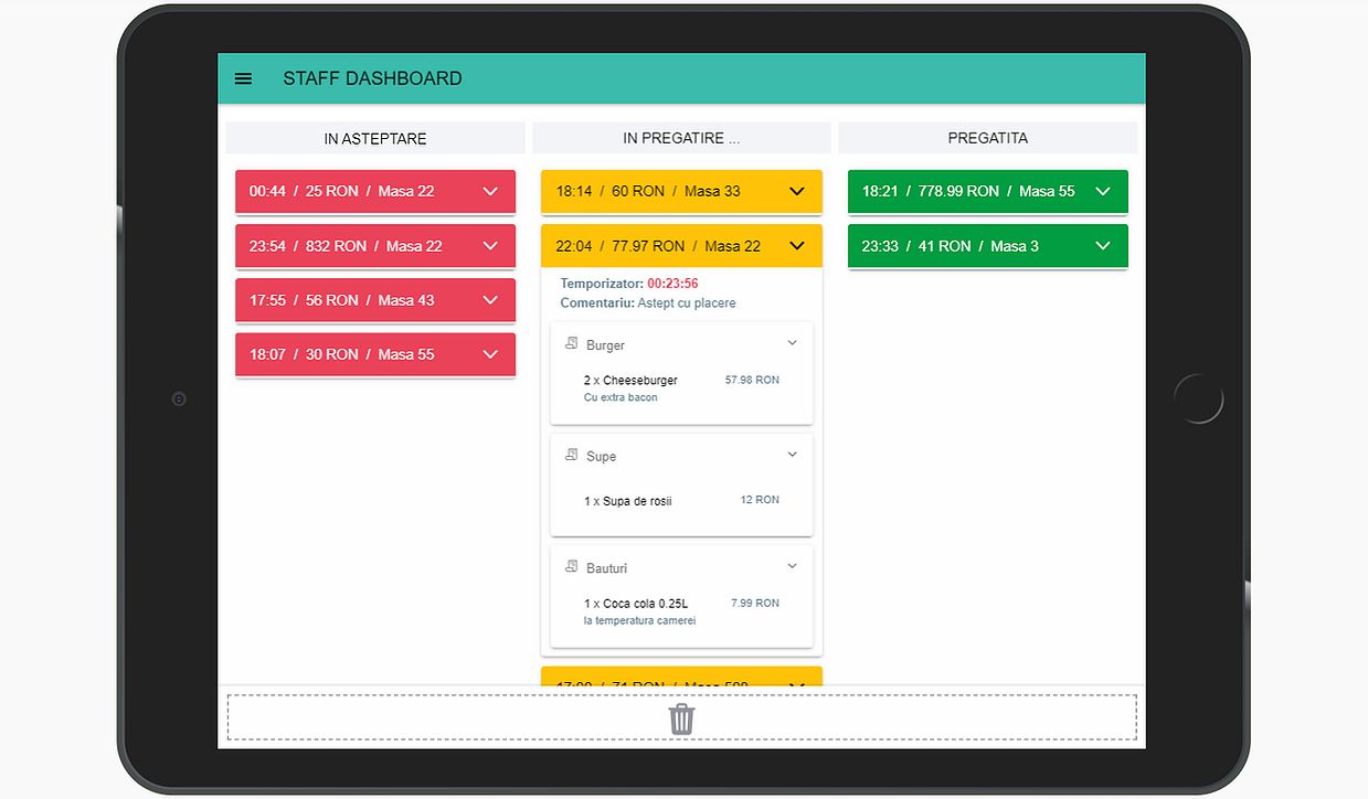 Aplicația pentru staff preia comenzile, oferă control asupra statusului lor, status ce va ajunge și la clienți în timp real. De asemenea, se oferă posibilitatea de a returna o comandă, returnarea banilor făcându-se automat către clienți.
