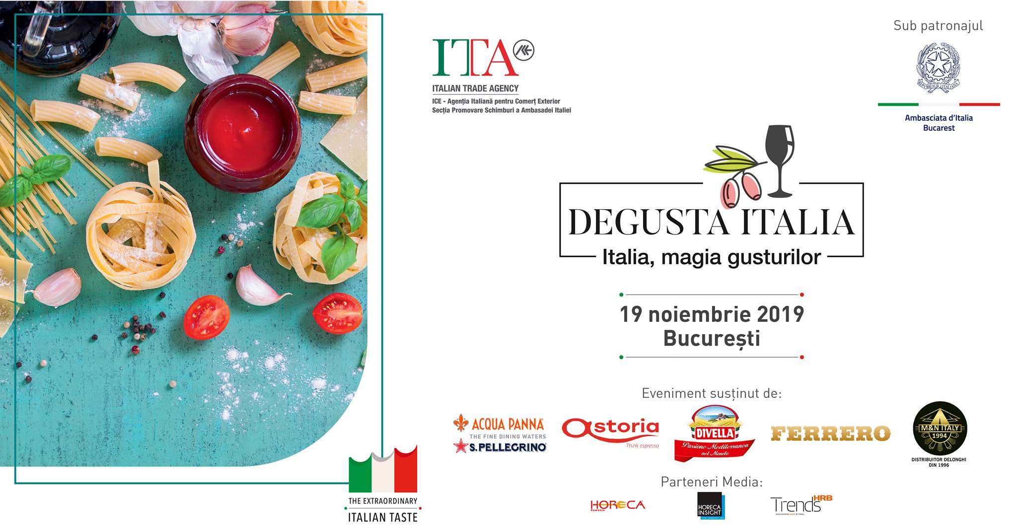 Biroul de la București al ICE – Agenția pentru Comerț Exterior, organizează marți 19 noiembrie, la Hotel Caro din București, cea de-a opta ediție a seriei de evenimente dedicate excelenței eno-gastronomice italiene: „Degusta Italia”. Evenimentul se desfășoară sub patronajul exclusiv al Ambasadei Italiei în România.