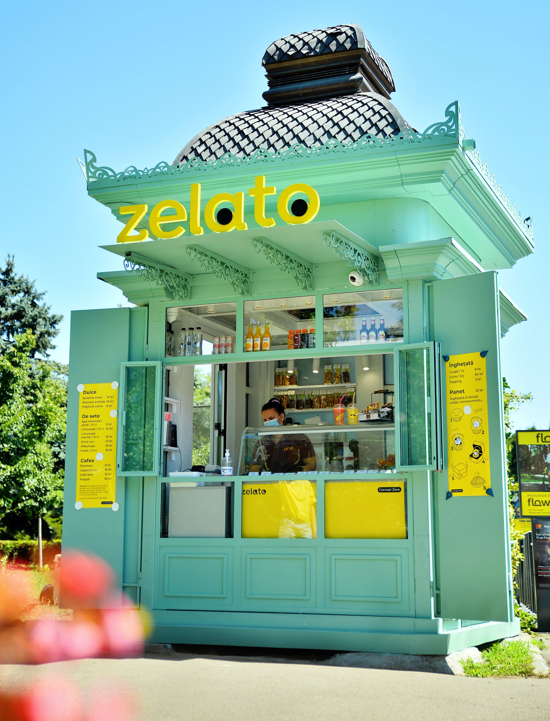 Obiectul de mobilier urban – un fel de producție româneasca care citează în diverse culori și materiale detalii de la mai multe tipuri de chioșcuri pariziene – deja existent la intrarea în parc – a fost acoperit într-o singură culoare delicioasă și a devenit un unit compact ce stârnește curiozitate și simpatie aproape instantaneu. Elementele contructive nou adăugate au fost gândite astfel încât să completeze discret structura existentă, respectiv obloanele și copertina metalice, precum și vitrina de servire. Cu o personalitate bine conturată și cu ajutorul branding-ului memorabil, pentru mine a fost important ca acest chioșc să recapete și sensul lui de reper în spațiul public urban, de punct de întâlnire”, a adăugat Laura Paraschiv, arhitectul și designerul din spatele Zelato.