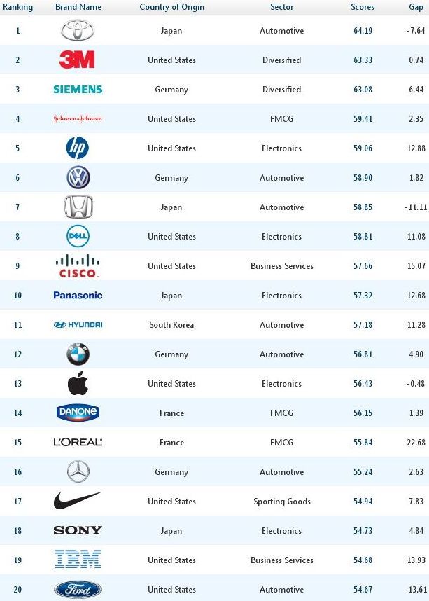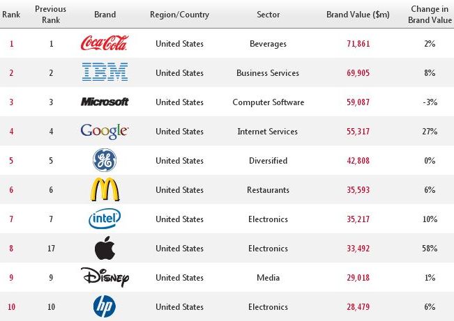 Interbrand a publicat recent raportul anual Best Global Brands. Coca-Cola se situează, pentru al doisprezecelea an consecutiv, pe locul 1, iar cel mai mare salt l-a înregistrat Apple care intră astfel în topul 10 pentru prima dată.