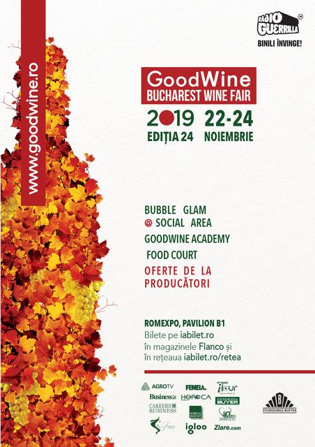 în perioada 22 – 24 noiembrie va avea loc, la Romexpo, în pavilionul B1, cea de a 24-a ediție a GoodWine – Bucharest Wine Fair, cel mai longeviv târg de vinuri din România. Evenimentul este conceput atât pentru specialiștii din industria viniviticolă, cât și pentru publicul larg. Vizitatorii vor putea degusta gratuit sute de vinuri de la crame de top românești și din străinătate și vor putea descoperi noutățile propuse de organizatori.