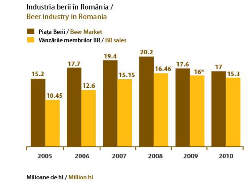 Piața berii din România a scăzut în 2010 pentru al doilea an consecutiv, potrivit ultimului raport al Asociației Berarilor, atingând un volum total de 17 milioane de hectolitri, cu 3,5% mai puțin ca în 2009 și cu 16% mai puțin față de nivelul anului 2008, când volumul vânzărilor de bere a atins o cotă maximă de 20,2 milioane de hectolitri. Vina? „Contextul economic instabil al țării noastre”, se arată în raportul Asociației Berarilor.