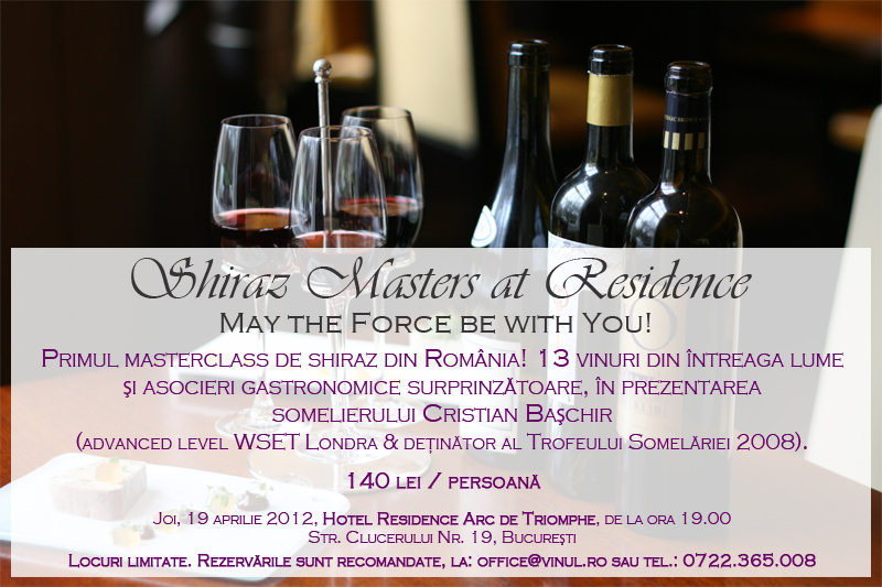 Primul masterclass de Shiraz din România va avea loc joi, 19 aprilie 2012, începând cu ora 19:00, găzduit de Hotel Residence Arc De Triomphe București. Frumusețea soiului Shiraz este dată de faptul că poate avea multiple valențe expresive, în funcție de tipul de climat din care provine, punând în valoare atât arta vinificatorului, cât și specificul zonei de proveniență.