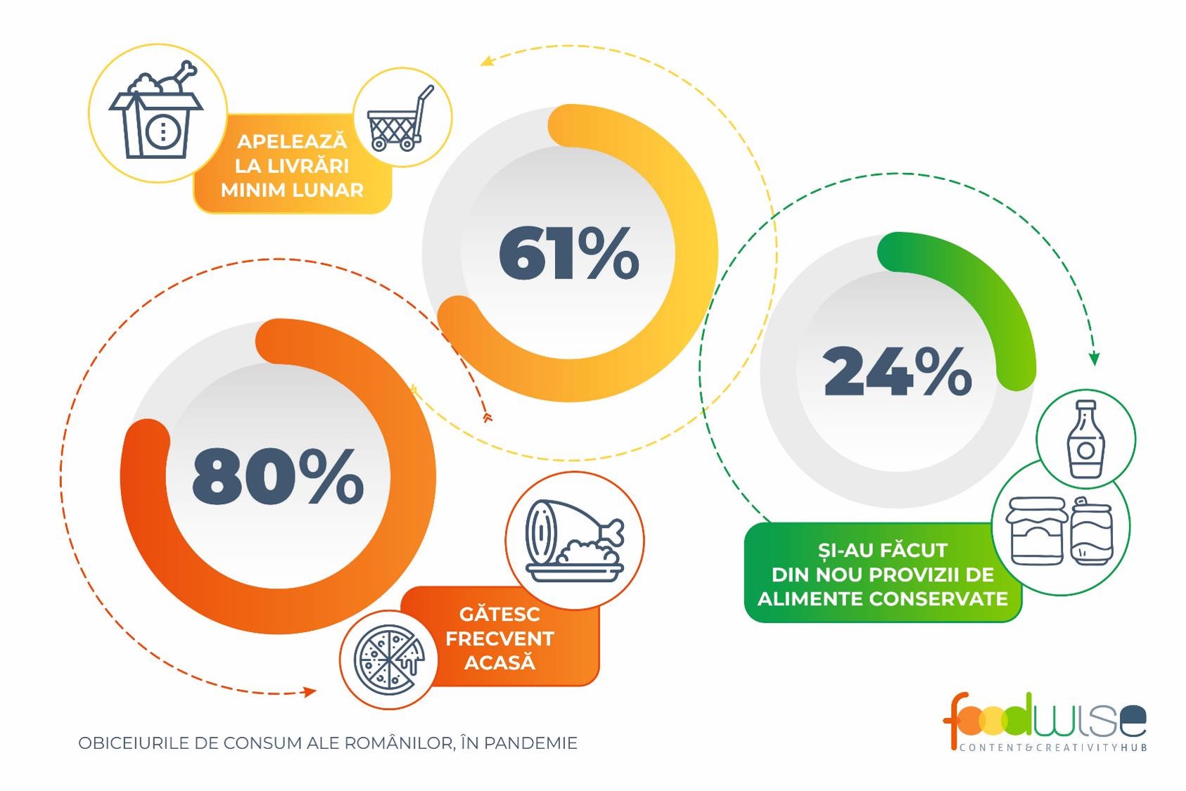 Studiul, efectuat în perioada 17-23 noiembrie 2020 pe un eșantion național de 1.683 respondenți, arată că 80% dintre respondenți gătesc acasă zilnic sau la două-trei zile, în timp ce 61% apelează la serviciile de livrare cel puțin lunar și aproape un sfert trece din nou la strânsul proviziilor de alimente conservate.