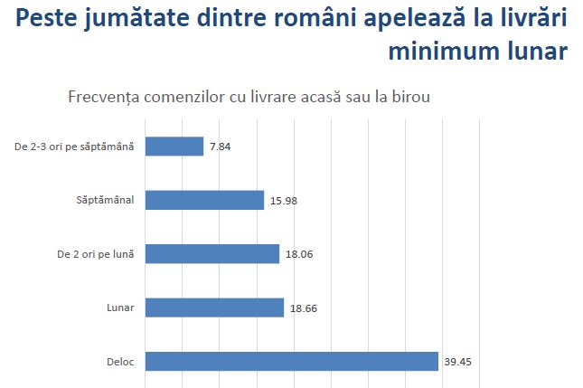 Odată cu restricțiile ce încurajează statul mai mult acasă, crește și deschiderea față de serviciile de livrare – peste jumătate dintre români comandă alimente și băuturi săptămânal, bilunar sau lunar, iar aproape 8% aleg livrarea mai frecvent, de două-trei ori pe săptămână.