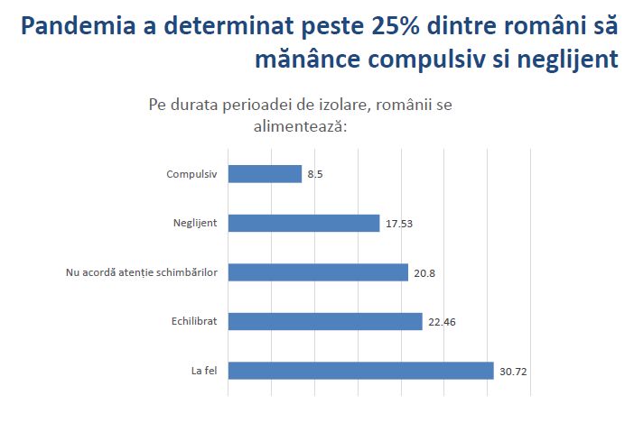 Dacă pentru 30% dintre români alimentația nu a suferit modificări, iar aproape un sfert dintre respondenți confirmă un meniu zilnic echilibrat, mai bine de 25% dintre respondenți spun că au fost afectați de restricții și au început să mănânce neglijent, compulsiv.