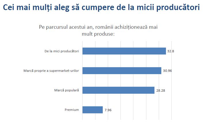 De altfel, micii producători sunt și câștigătorii pandemiei – o treime dintre respondenți au început să le achiziționeze mai mult produsele, pe parcursul acestui an. Și produsele marcă proprie din supermarket-uri atrag mai mult și ajung la 31% dintre preferințe, mărcile populare sunt cumpărate mai des de 28% dintre români, iar produsele premium sunt mai sus ca dezirabilitate pentru aproape 8% dintre respondenți.