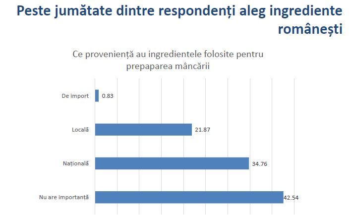 Studiul Foodwise Marketing* arată că pandemia i-a determinat pe respondenți să acorde o mai mare atenție provenienței ingredientelor sau tipurilor de mâncare pe care le consumă și să sprijine componenta românească. Astfel, 35% aleg produsele românești, 22% caută proveniența locală, de proximitate, în timp ce pentru 43%, decizia încă nu este influențată de acești factori.
