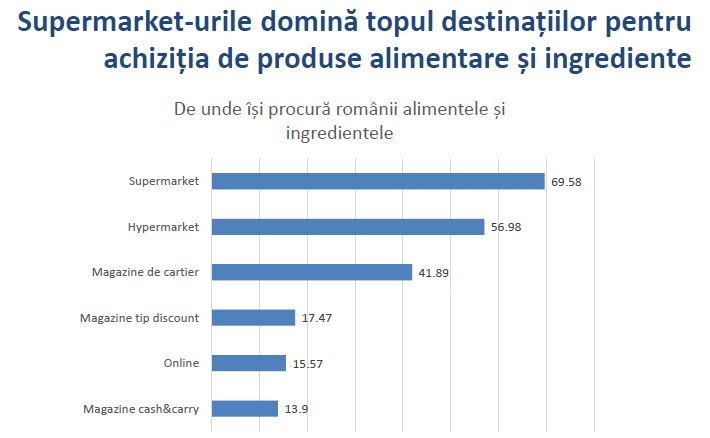 Supermarket-urile rămân destinația preferată pentru achiziția alimentelor și ingredientelor necesare consumului, cu aproape 70% dintre opțiuni, urmate de hypermarket-uri, cu 57%, și de magazinele de cartier, cu 42%. Mediul online ajunge la aproape 16% din preferințe, în studiul Foodwise Marketing.