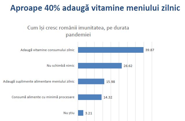 Pe de altă parte, respondenții sunt atenți la sănătate și, pentru a-și crește imunitatea, adaugă, în proporție de peste 40%, vitamine meniului zilnic, iar 16% optează pentru suplimentele alimentare. Aproape 14% au decis să consume alimente cu un nivel minim de procesare, în timp ce 27% nu schimbă nimic din modul obișnuit de alimentație.