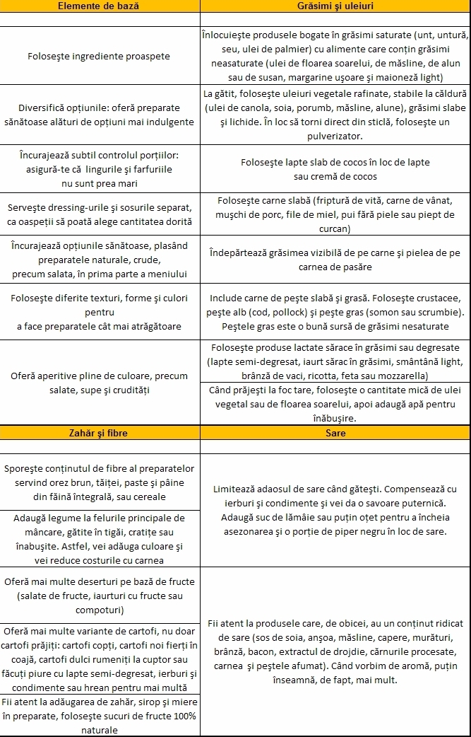 Soluțiile oferite de UFS (vezi graficul de mai jos) se concentrează pe modificări la îndemână care să reducă cantitatea de grăsimi din preparatele nesănătoase, dar și pe mici trucuri pentru ca cele sănătoase să fie vizual și aromatic mai atrăgătoare pentru clienți. Studiul local a arătat că aceștia se simt atrași de descrierile apetisante din meniuri: puși în fața unei descrieri simple și a uneia apetisantă a aceluiași preparat, 64% dintre ei au preferat-o pe a doua. Prezentarea felurilor de mâncare din meniuri trebuie să fie atrăgătoare atât din punct de vedere al fotografiilor și descrierilor din meniu, cât și din punct de vedere al servirii și aranjării în farfurie.
