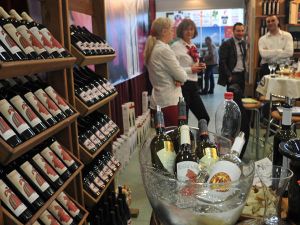 Degustare de vin în cadrul unei expoziții de artă contemporană.