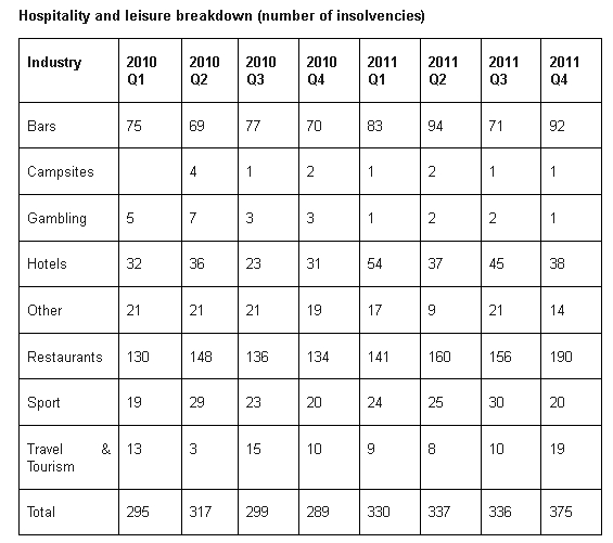 Numărul restaurantelor, barurilor și hotelurilor care au intrat în insolvență în semestrul 4 din 2011, în Marea Britanie, a crescut cu 32% față de același semestru din 2010, ajungând la 375 (față de 289 înregistrate în semestrul 4 din 2010), potrivit celei mai recente analize a companiei PricewaterhouseCoopers (PwC), citată de site-ul BigHospitality.co.uk.