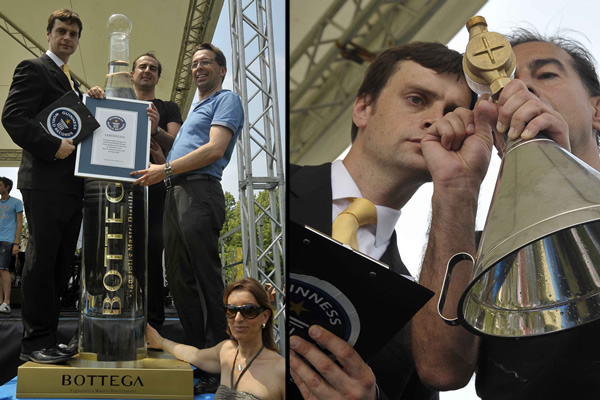 Producatorul Italian de lichioruri, Distilleria Bottega a stabilit un nou Guinness World Record pentru cea mai mare sticla de grappa din lume, Grappa este un lichior din tescovina (boasca sau prastina in limbaj traditional) de struguri, cu un continut de alcool intre 35 si 60%. Sticla produsa de artizanii de la Distilleria Bottega are 1,86 metri inaltime si contine 138 de litri de prosecco grappa. Reprezentantii Guinness World Records au masurat sticla si au fost martorii umplerii acesteia cu lichior in regiunea Sant’Artemio Park din Treviso, in prezenta a 6.000 de participanti. Pregatirea sticlei a durat 8 luni, 200 de ore de munca si maiestria a sase artizani ai sticlei venetieni. Presedintele Distilleria Bottega, Sandro Bottega a dedicat sticla cu diametrul de 25 cm, circumferinta de 110 cm si 5 cm grosime, Provinciei Treviso pentru a promova cultura culinara a regiunii.