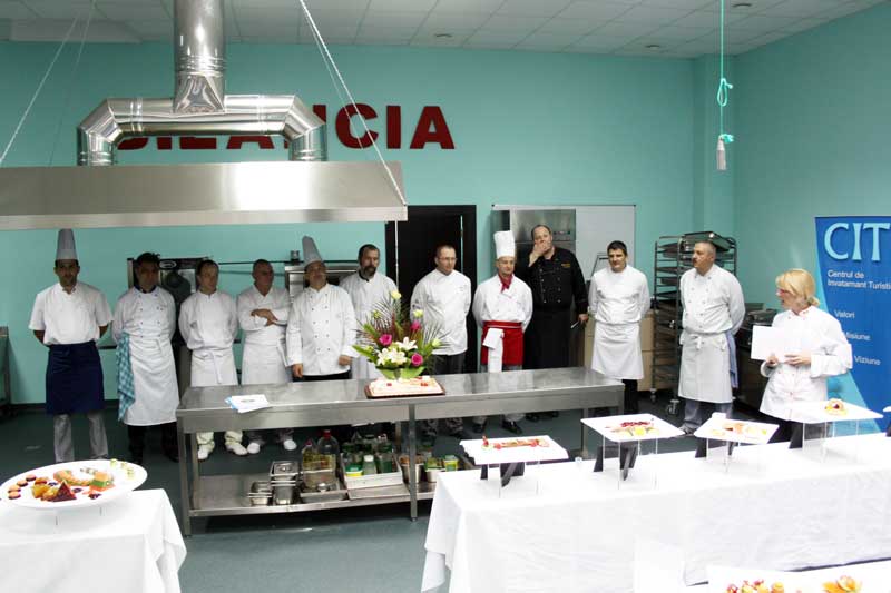 Astazi, 22 iunie 2010 in cadrul AROMA – Centrul de Excelenta in Gastronomie si Tehnologie Alimentara – s-a incheiat cursul de Specializare „Maestru in Arta Culinara†organizat de Centrul de invatamant Turistic CIT SA. Dintre cei 12 cursanti care au participat la acest curs, doar 6 au promovat examenul de Maestru in arta culinara in urma caruia vor obtine si diploma de specializare de la CNFPA. Cursul este o premiera absoluta in materie intrucat este primul de acest fel organizat de la intrarea in COR (Codul Ocupatiilor din Romania) a meseriei de „Maestru in arta culinaraâ€. Centrul AROMA s-a alaturat acestui demers inovator punand la dispozitia cursantilor baza materiala necesara si indispensabila desfasurarii unui asemenea eveniment. Examenul final a constat in expunerea preparatelor in fata comisiei desemnate de CNFPA si a specialistilor. Acestea au putut fi evaluate tehnic si artistic si desigur degustate de publicul numeros, reprezentanti ai presei si specialisti in domeniu prezenti la acest eveniment deosebit de important pentru domeniul restauratiei.