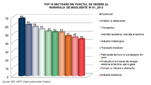 Construcțiile, HoReCa și Transporturile sunt sectoarele cu cel mai ridicat nivel al insolvențelor deschise în primul semestru al anului curent raportat la numărul firmelor active. De menționat că aceleași sectoare au fost incluse în top 5 sectoare cu cele mai ridicate valori pentru acest indicator și pentru anul 2012, ceea ce indică persistența unor probleme sistemice structurale, subliniază reprezentanții Coface România.