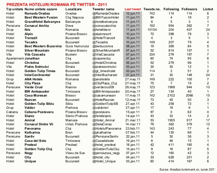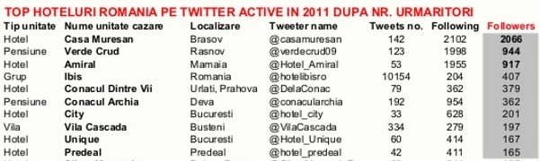 – Se pare că turiștii nu îndrăgesc atât de mult această rețea socială. Poate în Romania da, dar la nivel de Europa/ America / restul continentelor acest lucru nu este valabil, hotelurile fiind cunoscute organizatoare de evenimente sau având oaspeți străini într-o proporție ridicată, se arată în studiul TurisMARK. Pe de altă parte targetarea Twitter (oameni de marketing, PR, antreprenori, manageri) este destul de specializată ceea ce nu justifică prezența scăzuta a hotelurilor pe Twitter.