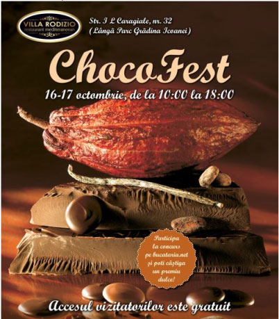 Festivalul de dulciuri ChocoFest isi redeschide portile intre 16 si 17 octombrie 2010, la restaurantul Villa Rodizio din Bucuresti. Vizitatorii vor putea degusta si achizitiona diverse specialitati din ciocolata, bomboane fondante, dulceturi, checuri, cozonaci, ciocolata de casa, prajituri si chiar dulciuri bio. Iar pentru ca decorul sa fie complet, organizatorii pun la dispozitie diverse sortimente de cafea si ceaiuri. Festivalul ChocoFest, ajuns la a treia editie, debuteaza sambata la 10:00 dimineata si isi inchide portile duminica la 18:00. Intrarea este libera.