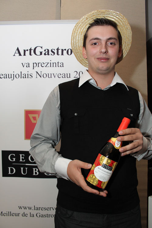 Sarbatoarea „Beaujolais Nouveau†s-a incheiat vineri, in Romania, cu Gala de premiere a castigatorilor faimoasei competitii in toata lumea, cursa”Gar§on de Caf©â€, organizata pentru prima data in Romania, pe 18 octombrie 2010, in centrul istoric al Bucurestiului. 30 de chelneri au luat startul la concurs si au parcurs 600 metri cu o tava cu 5 pahare umplute pe jumatate cu vin. Cursa a fost castigata de Arapalea Mirel Costin, de la restaurantul Le Bistro, din cadrul Hotel Centre Ville, care a fost premiat cu o calatorie de patru zile la « Bocuse d’Or Ã‚», la Lyon, in ianuarie 2011.