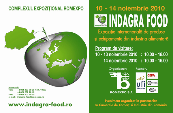 Expozitia internationala de produse si echipamente din industria alimentara, IndAgra Food s-a deschis astazi la complexul expozitional Romexpo. Evenimentul, ajuns la a treia editie, se va desfasura pana pe 14 noiembrie 2010. Editia de anul trecut IndAgra Food a reunit nu mai putin de 224 firme expozante din 22 de tari, ponderea expozantilor straini fiind de 50% din totalul participantilor. Peste 4500 de vizitatori au trecut atunci pragul expozitiei, din care 2061 specialisti.