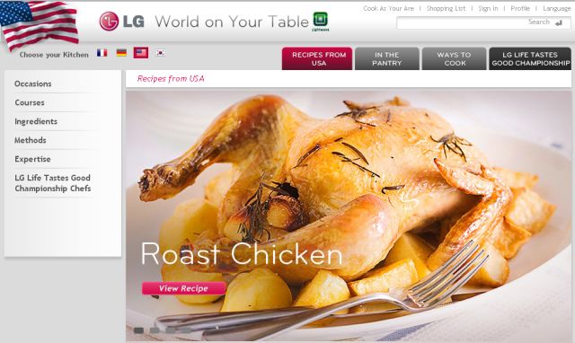 LG Electronics lanseaza, la nivel global, portalul online de gastronomie care ofera consumatorilor peste 130 de retete celebre din diverse tari. Avand incluse sfaturi gastronomice atat pentru bucatarii amatori, cat si pentru profesionisti, alaturi de alte aplicatii interesante, site-ul este creat special pentru pasionatii de gastronomie care doresc sa recreeze bucataria internationala in propria locuinta.