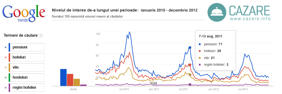 În 2012 în perioada de vârf a căutărilor pe Google, în plin sezon, diferența dintre căutările pentru segmentul de pensiuni a fost și cu 35% mai mult față de segmentul de hoteluri.