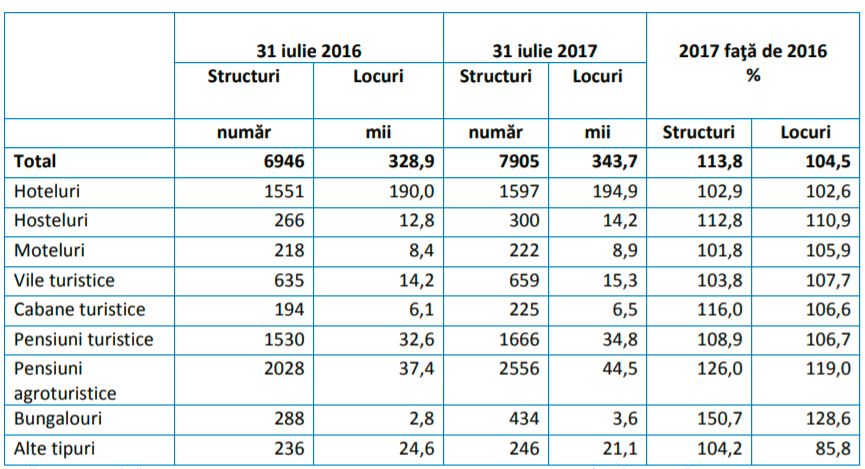 Capacitatea de cazare turistică a crescut la 31 iulie 2017 cu 4.5% față de 31 iulie 2016