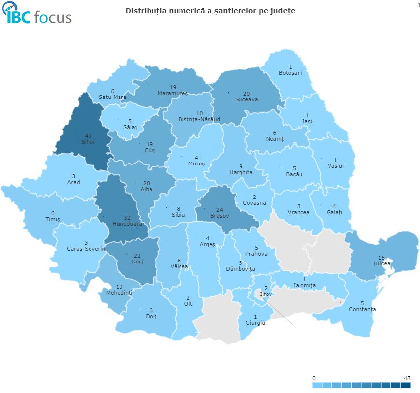Revenind la investițiile în pensiuni care se anunță în următoarea perioadă, observăm faptul că majoritatea acestora sunt concentrate în jurul zonelor montane, în sudul și sud-estul țării figurând prea puține astfel de investiții. Așadar, în fruntea listei ca număr de investiții regăsim județul Bihor, cu 43 de pensiuni aflate în construcție, urmat de județele Hunedoara (32 de investiții) și Brașov (24 de investiții). La polul opus găsim județele Teleorman, Buzău, Brăila și Călărași, unde nu au fost identificate investiții în noi pensiuni. De asemenea, mai remarcăm și faptul că, în perioada analizată, și capitala țării figurează cu zero investiții în pensiuni.