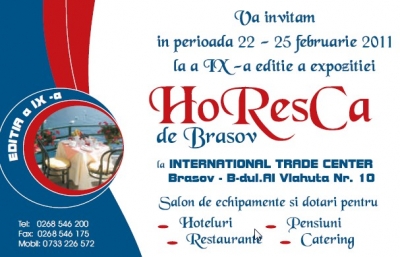 ÃŽn perioada 22-25 februarie 2011 se desfasoara la Brasov „HoResCa de Brasovâ€, targ de echipamente si dotari profesionale pentru Hoteluri, Restaurante si Catering, ajuns la a noua editie. HoResCa de Brasov este un eveniment destinat profesionistilor din sectorul hotelier si restauratie, la care sunt invitati sa participe producatori, distribuitori, importatori si exportatori de produse si servicii destinate industriei hoteliere si restaurantelor, cafenele, baruri, furnizorilor de servicii de catering.