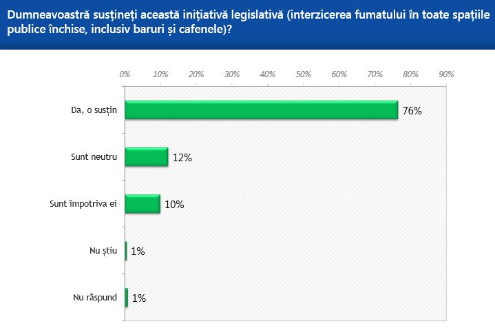 Potrivit studiului, 93% dintre participanți au auzit despre legea care interzice fumatul în spațiile publice din România. Procentul celor care sunt informați cu privire la această lege, conform declarațiilor lor, crește direct proporțional cu vârsta respondenților și cu nivelul lor de educație. 79% dintre intervievați au o părere bună sau foarte bună cu privire la această lege și doar una din zece persoane chestionate are o părere proastă sau foarte proastă față de legea privind interzicerea fumatului în spațiile publice. Inițiativa legislativă este susținută de trei sferturi dintre respondenți și 10% dintre ei declară că sunt împotriva acestei inițiative legislative.