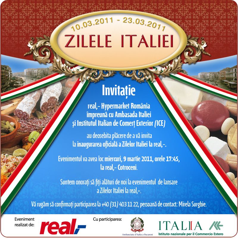În perioada 10-23 martie la real Hypermarket se desfășoară o amplă campanie de promovare a produselor italiene. Peste 200 de produse noi, provenind de la furnizori din toată Italia sunt oferite în cele 25 de magazine ale rețelei din România. Produsele provin de la firme care au deja un nume pe piața internațională și care încearcă acum să intre și pe piața românească de profil.