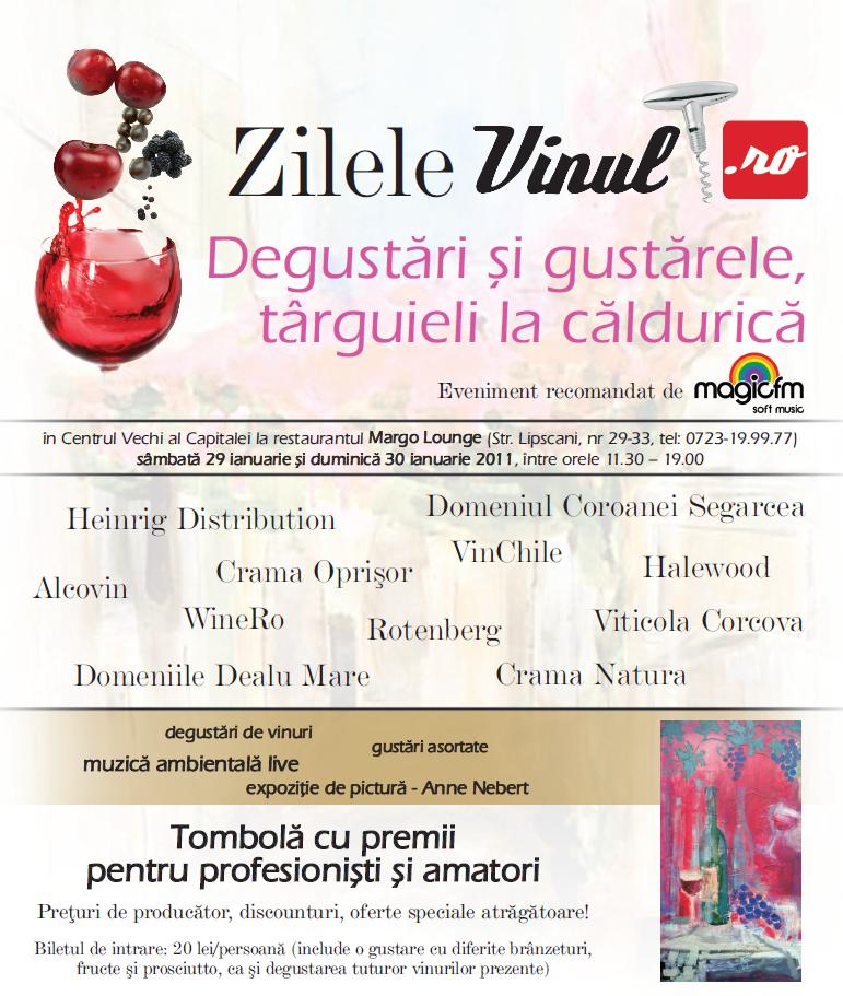 in perioada 29-30 ianuarie 2011 se desfasoara primul eveniment din seria¾Zilele Vinul.ro†– doua zile de targ cu vinuri de excelenta, muzica live si gustari asortate. Evenimentul „va fi o inovatie in domeniul targurilor de vinâ€, promit cei de la Vinul.ro si se va desfasura la restaurantul Margo Lounge din centrul istoric al Bucurestiului (str Lipscani, nr 29-33). in functie de interesul manifestat de public, Zilele Vinul.ro isi propune sa devina un eveniment lunar de promovare a culturii vinului pentru amatori si profesionisti.
