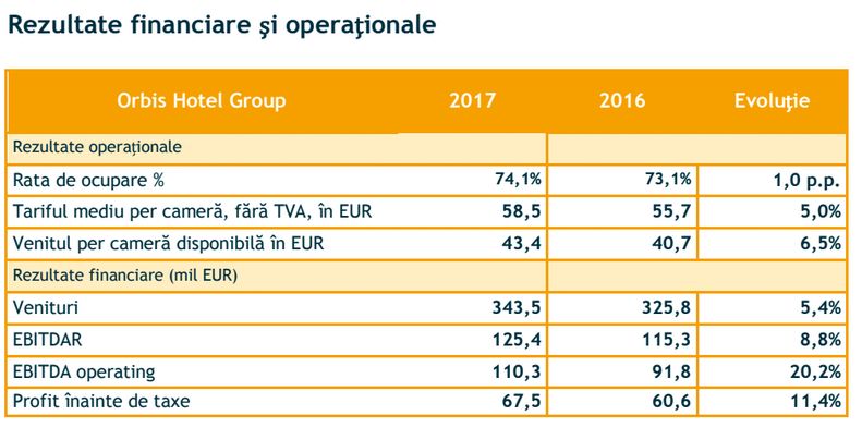 Cele mai performante piețe au fost Budapesta, Varșovia și Praga cu creșteri de două cifre ale RevPAR. în total, indicatorul RevPAR al hotelurilor Orbis în 2017 a crescut cu + 6,5% (până la 43,4 EUR) față de 2016. Creșterea a fost posibilă în mare parte datorită evoluției tarifului mediu, în creștere cu + 5% pe an.