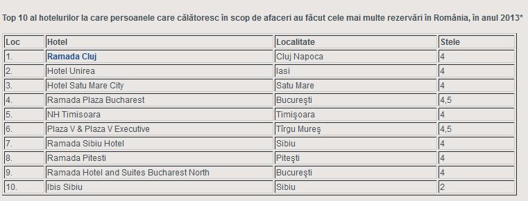 Portalul internațional de rezervări hotel.info a efectuat o analiză a rezervărilor din segmentul unităților cu 2-4 stele (inclusiv 4,5 stele) făcute de persoane care au călătorit în scopuri de afaceri în anul 2013 și a stabilit care sunt hotelurile de business cu cele mai multe rezervări din România și din întreaga lume.