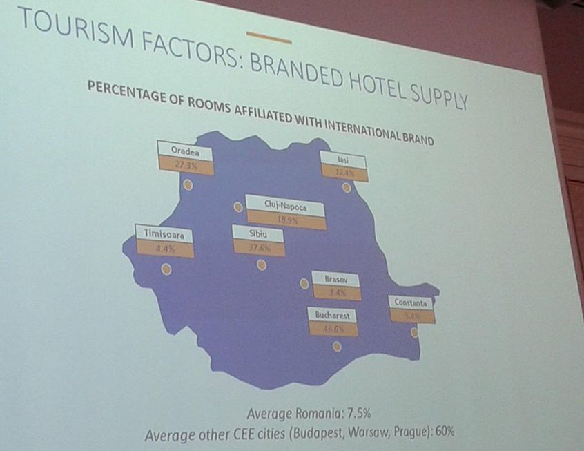 Potrivit datelor STR Global, orașele din România cu cele mai multe camere de hotel afiliate la un brand internațional sunt București (cu 46.6% din camere afiliate la un brand internațional), Sibiu (37.5%), Oradea (27,3%) și Cluj-Napoca (18.9%).