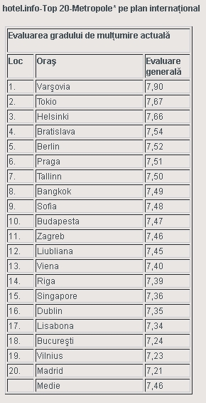 Potrivit celui mai recent sondaj global realizat de hotel.info referitor la gradul de mulțumire al oaspeților hotelieri din 20 de capitale ale lumii, Bucureștiul a scăzut un loc în top, ajungând pe locul 18. Serviciile hoteliere din Varșovia (capitala Poloniei) au reușit să câștige cele mai multe puncte de la oaspeții lor, aceștia apreciind în mod deosebit calitatea serviciilor din acest oraș. Și de serviciile de cazare din Tokio oaspeții hotelurilor au fost foarte mulțumiți. Capitala Japoniei a înaintat în Top 20 de pe poziția a treia (la evaluarea din august) pe poziția 2 la evaluarea curentă. Pe locul 3 în clasamentul actual se situează orașul Helsinki, capitala Finlandei.