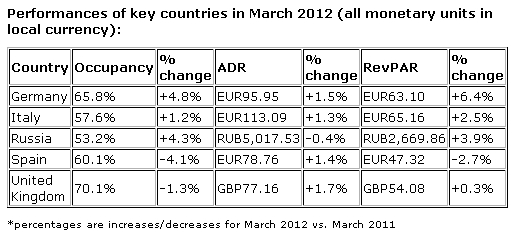 Referitor la situația din luna martie 2012, industria hotelieră din Europa a înregistrat o creștere de 3% a tarifului mediu zilnic (ADR), însă gradul de ocupare al hotelurilor a stagnat, a declarat Elizabeth Randall, managing director la compania STR Global. Cea mai mare scădere a gradului de ocupare în luna martie s-a înregistrat în Viena (-8,7% față de aceeași lună a anului trecut), acesta ajungâng la 67,5%, în timp ce creșterea cea mai mare a gradului de ocupare s-a înregistrat în capitala Islandei, Reykjavik (+17,9%), gradul mediu de ocupare fiind aici de 66,8%.