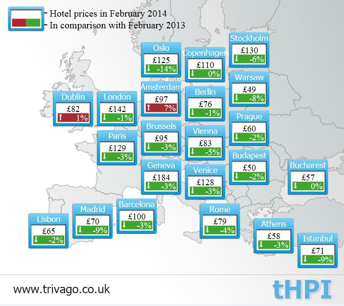 Tarifele hoteliere au scăzut în medie cu 7% în luna februarie a acestui an la nivel european, comparativ cu luna februarie a anului trecut, potrivit Indexului Prețurilor Hoteliere realizat de site-ul trivago, bazat pe 23 cele mai populare țări europene pe trivago. O noapte de cazare în luna februarie 2014 costă în medie 82 de lire sterline, comparativ cu 88 lire sterline în luna februarie 2013.