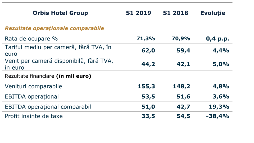 Performanța din prima jumătate a anului 2019 evidențiază eficacitatea strategiei Orbis. Rezultatele din întreaga regiune a Europei de Est au rămas puternice cu o creștere a RevPAR cu +5%. Principalul motor al creșterii a fost prețul mediu, cu +4,4% ADR. Veniturile consolidate din prima jumătate a anului 2019 au constituit 155,3 milioane EUR, în creștere cu 4,8%. EBITDA al grupului s-a ridicat la 51 de milioane EUR cu o creștere de 19,3%’, informează reprezentanții companiei.