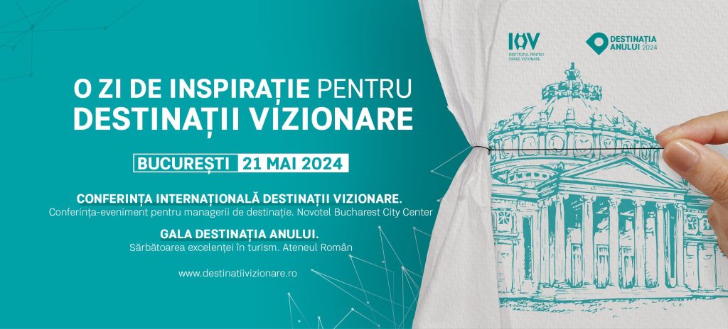 Pe 21 mai 2024 are loc la București cea de-a doua ediție a conferinței DESTINAȚII VIZIONARE, un eveniment de management și marketing de destinație din România. Anul acesta, în premieră, conferința este urmată de Gala DESTINAȚIA ANULUI, la Ateneul Român, o seară de celebrare a brandurilor turistice deja consacrate, câștigătoare ale competiției Destinația Anului. Cele două evenimente sunt organizate de Institutul pentru Orase Vizionare, asociație de educație și consultanță în place branding si placemaking, și Destinatia Anului, o importantă competiție de promovare a turismului intern, cu scopul de a ajuta la construcția și afirmarea de branduri turistice puternice în România și la dezvoltarea competențelor profesionale în domeniu.