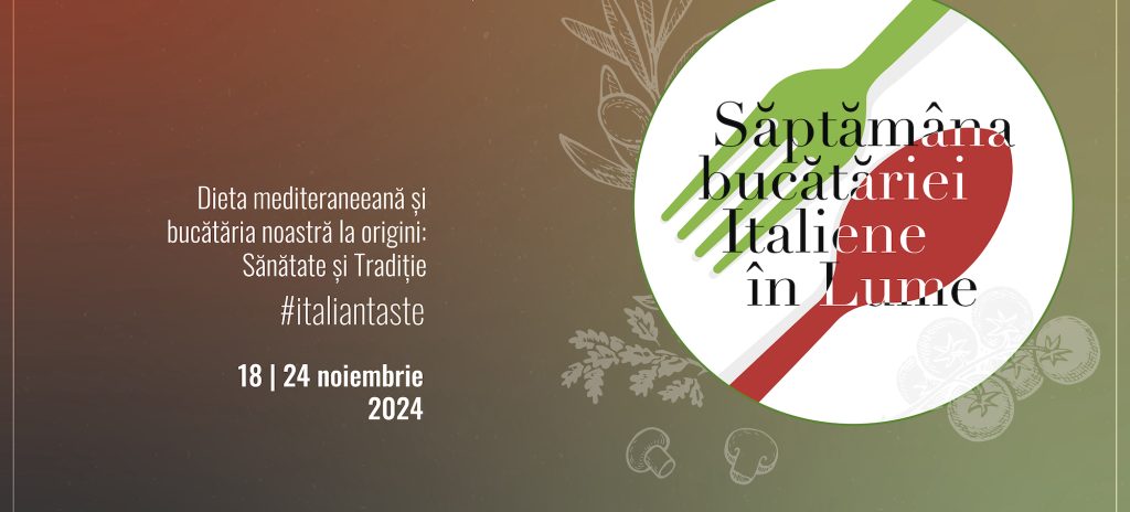 Ambasada Italiei în România, ICE-Agenția Italiană pentru Comerț Exterior și Institutul Italian de Cultură din București sărbătoresc cea de-a 9-a ediție a Săptămânii Bucătăriei Italiene în Lume printr-un program de inițiative având ca temă principală anul acesta: „Dieta mediteraneeană și Bucătăria noastră la Origini: Sănătate și Tradiție”.