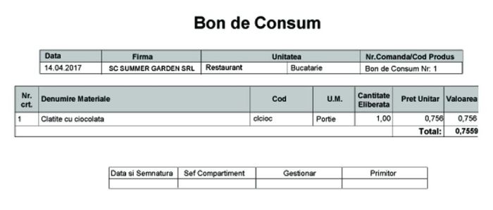 La pasul 6, se face descărcarea din gestiune pe baza bonului de consum ilustrat mai jos.