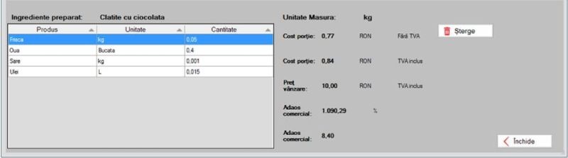 La restaurantul “Summer Garden” s-a hotărât vânzarea către populație a unui nou preparat culinar denumit “Clătite cu ciocolată”. La pasul 1 preparatul este definit în VilicoGest cu rețeta prezentată în ilustrația de mai jos.