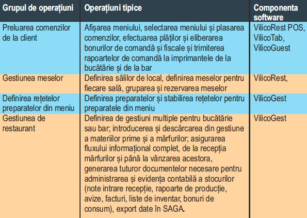 O privire sintetică a operațiunilor de management de restaurant, grupate pe funcțiuni și, de asemenea, pe componentele platformei VilicoRest, este prezentată în ilustrația de mai jos.