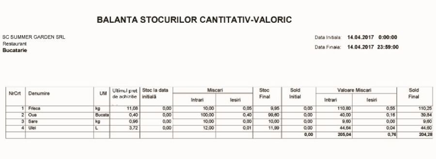 Balanța stocurilor conform criteriului cantitativ-valoric este ilustrată alăturat și reflectă descărcarea din gestiune a articolului Clătită cu ciocolată.