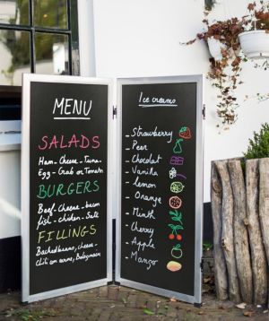 Tablele de scris pentru cretă de exterior/trotuar creează un impact eficient, promovează informații la nivelul ochilor pentru pietoni, invitând oamenii să intre sau să cumpere. O tablă de exterior va crește traficul de afaceri, gradul de conștientizare și va oferi în final un avantaj competitiv.