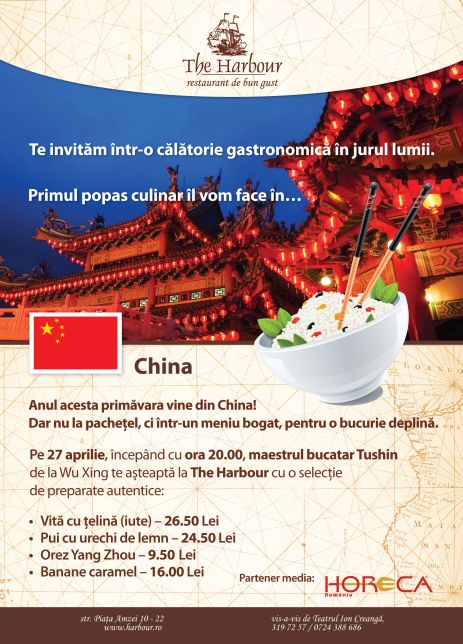 Restaurantul The Harbour deschide seria evenimentelor dedicate gastronomiei internaționale. Primul popas culinar va fi în… China. O dată pe lună, restaurantul va fi scena delectării culinare, în care oaspeții și nu numai vor putea gusta o varietate de preparate specifice unei țări cu o gastronomie cu tradiție.